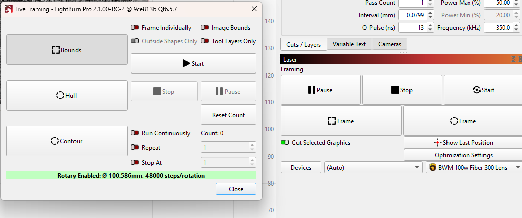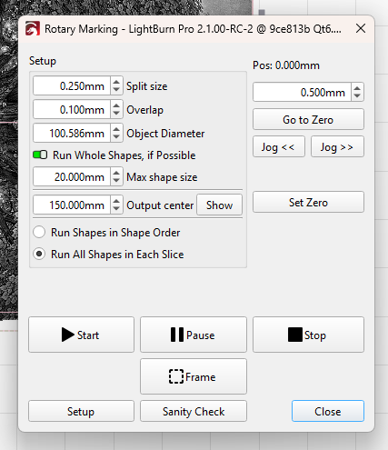 But when I go to run it, and I click on Frame to see it separated into pieces, it rotates almost 180° from where I want it to start the engrave, and only shows the dot, not the outline of each section to click thru.