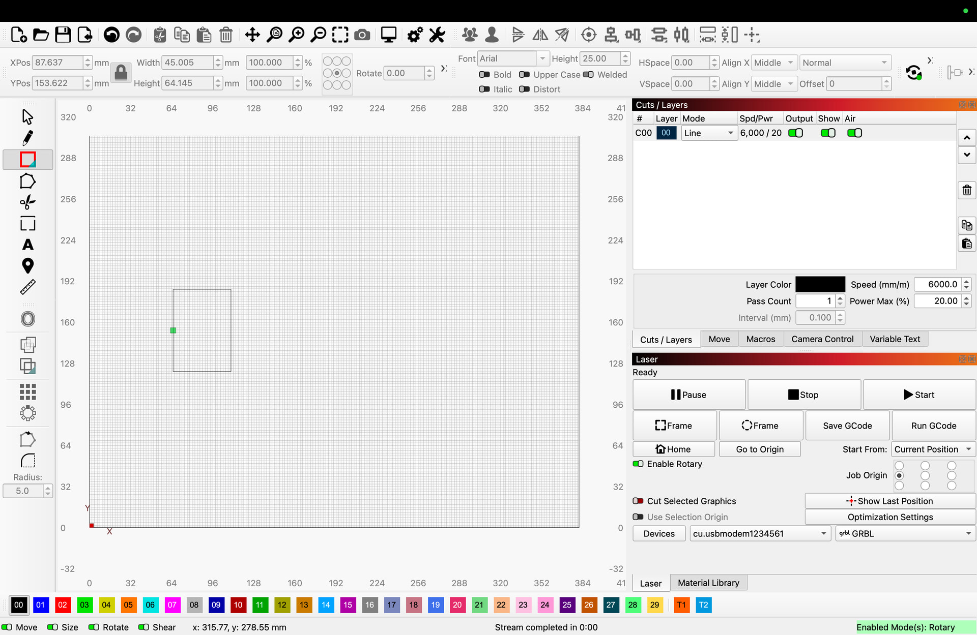seems the only one that works correct, makes the rotary actually turn and not the head of the laser moving in the x and y is setting it to the A axis but that then greys out the revoltions per mm.