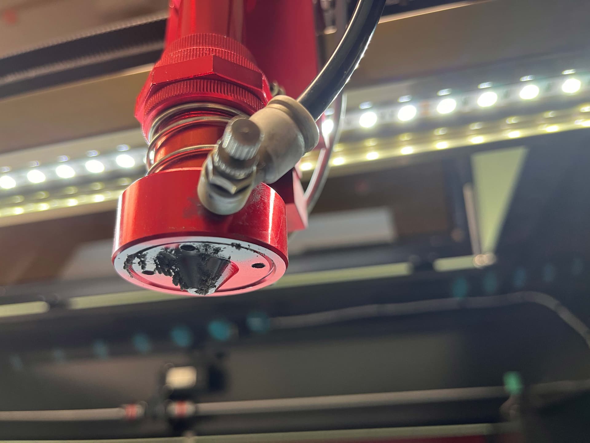 How can I stop soot from accumulating on the laser head tip when lasering LASERMAX rowmark? I have to stop & clean off the tip sometimes after a run that only takes a few minutes. This is really slowing down our production time.