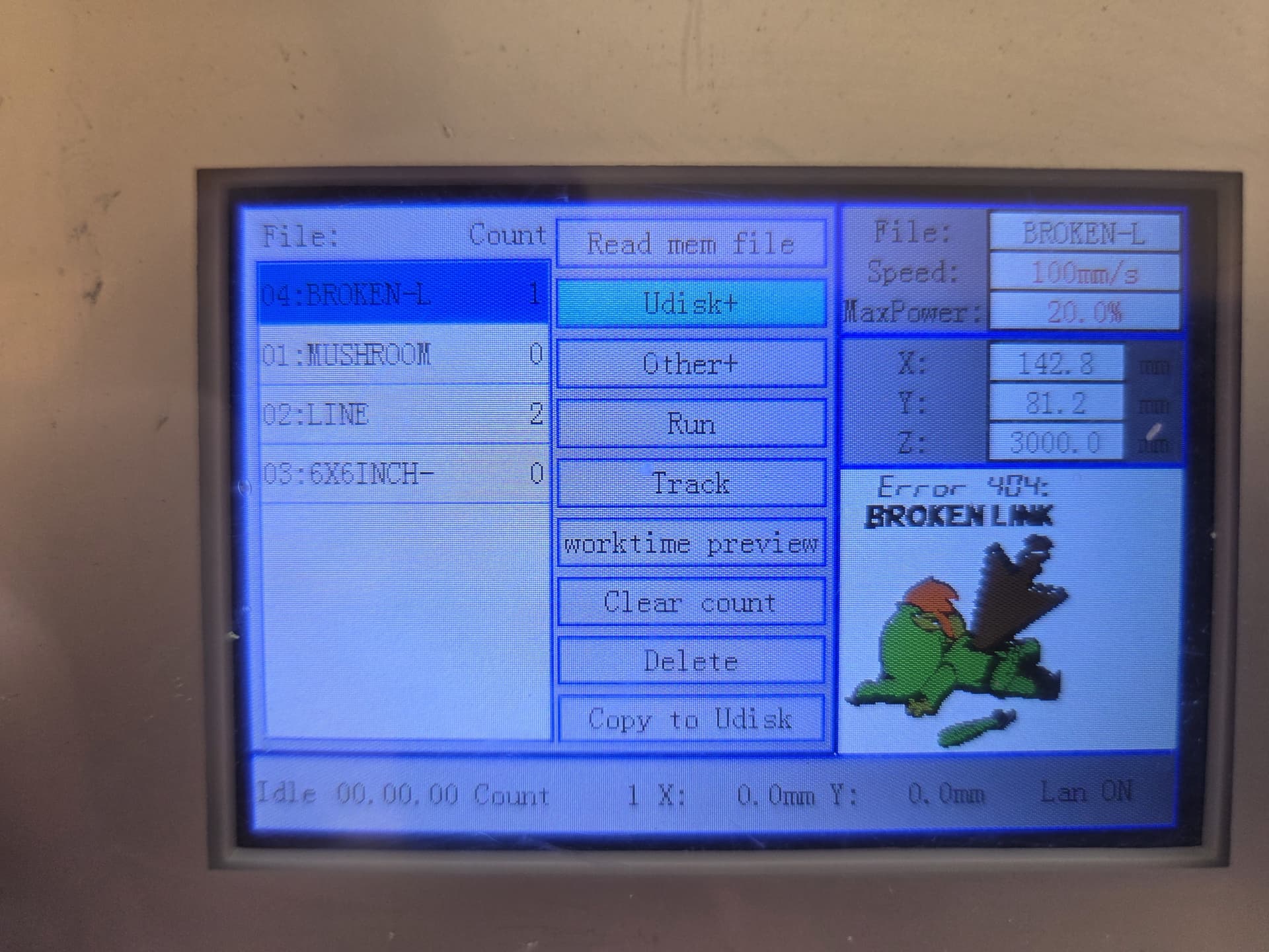 I need help with my Ruida 644xg controller, on my 50w Blue/white China laser (the manual shows Morn). When I turn on my CO2 laser, select “File” I see 12 files in memory. But then instead of a preview in the botton right panel it changes the “No Device Found” and stops taking input. I can’t select any actions.