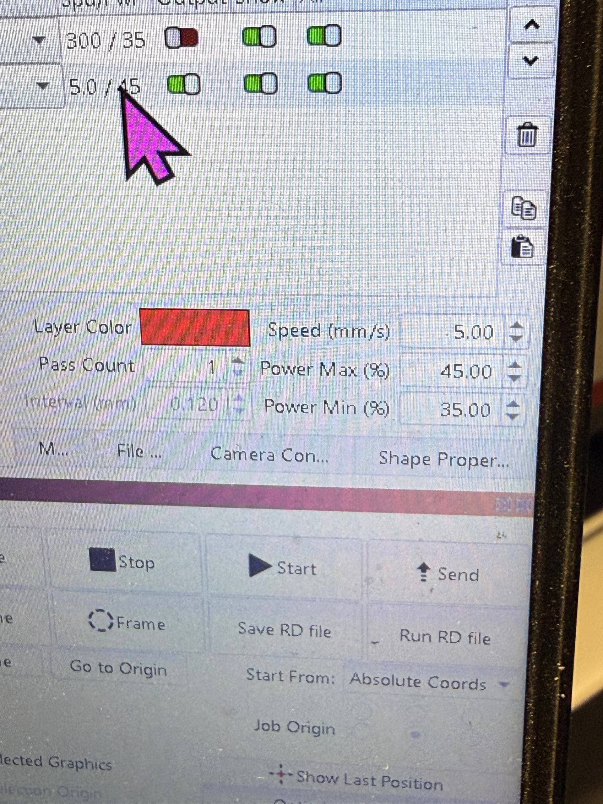 Okay, @Colin THANK YOU! As far as the rest, didn’t even need to go beyond the usual suspect controller. I’ll be dead honest, I’ve been engraving for 17 years, the last couple with a Ruida but have not once read the manual. I will now because I was being throttled by settings that made no sense from some jerky who sent me the wrong tube in my machine. Shoulda checked! 50% and I wondered why my 80 watt smoked it and the 100 watt couldn’t. So, “user parameters>engrave settings”. changed it to 99% for a 50% test and smoked through it in one pass, clean as a whistle! Now did someone move the QR codes? Can we also not have “offset” pop up window not go directly over what I’m offsetting? It’s the little things.