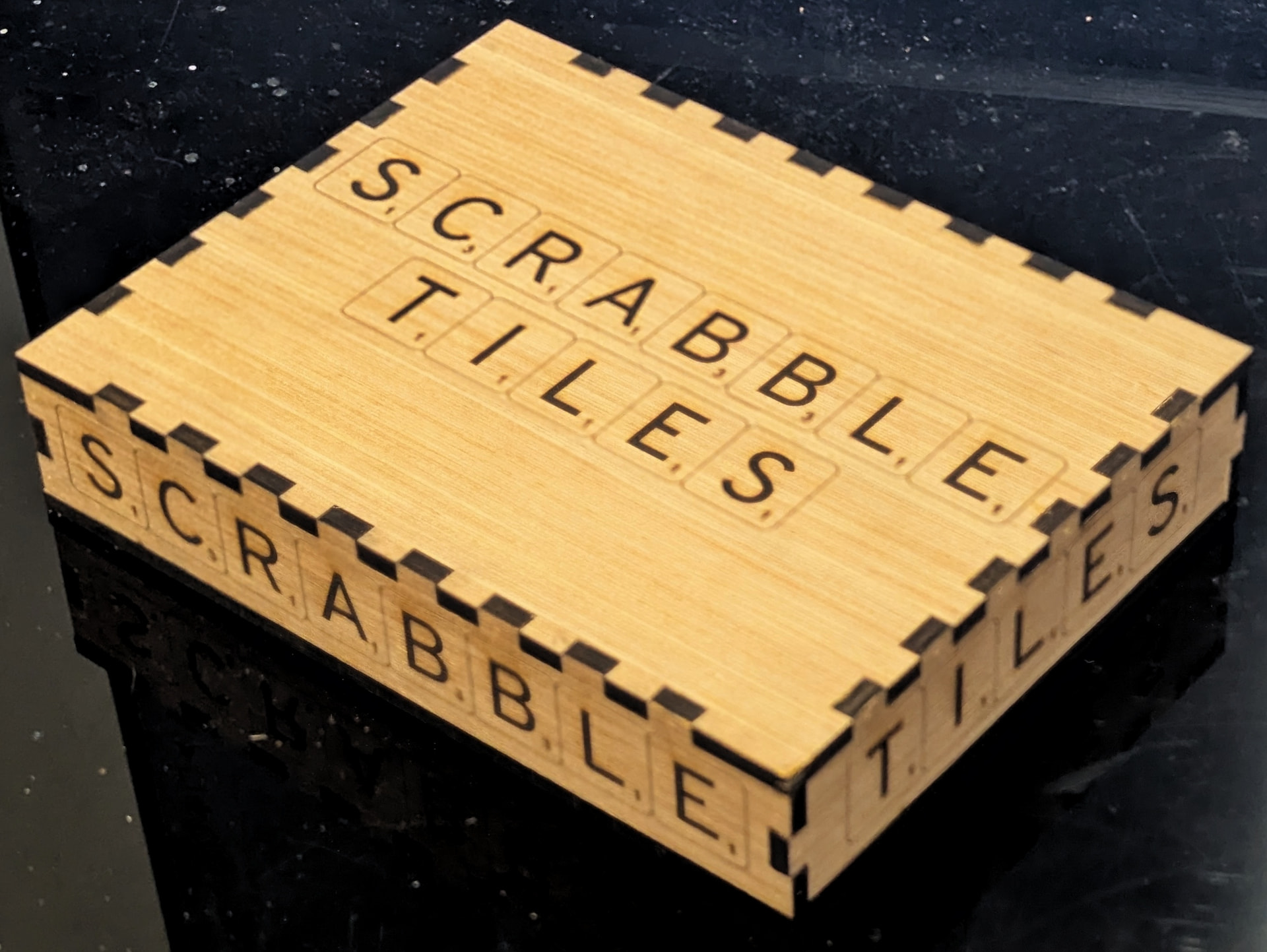 Naturally, now that I had a full set of tiles, my mind immediately alerted me to the absolute necessity of sending them in a nice custom box. I mean, they’re a gift… and having a bespoke perfectly-sized storage box might help prevent future tile misplacements. I had the remnants of some 5mm plywood, so a quick trip to Boxes.py, followed by some tweaks of the inside wall connections in Inkscape, and I was in business. The 100W CO2 laser made quick work of the cutting, and my 23ga pin nailer was delightful as always in making the assembly permanent.