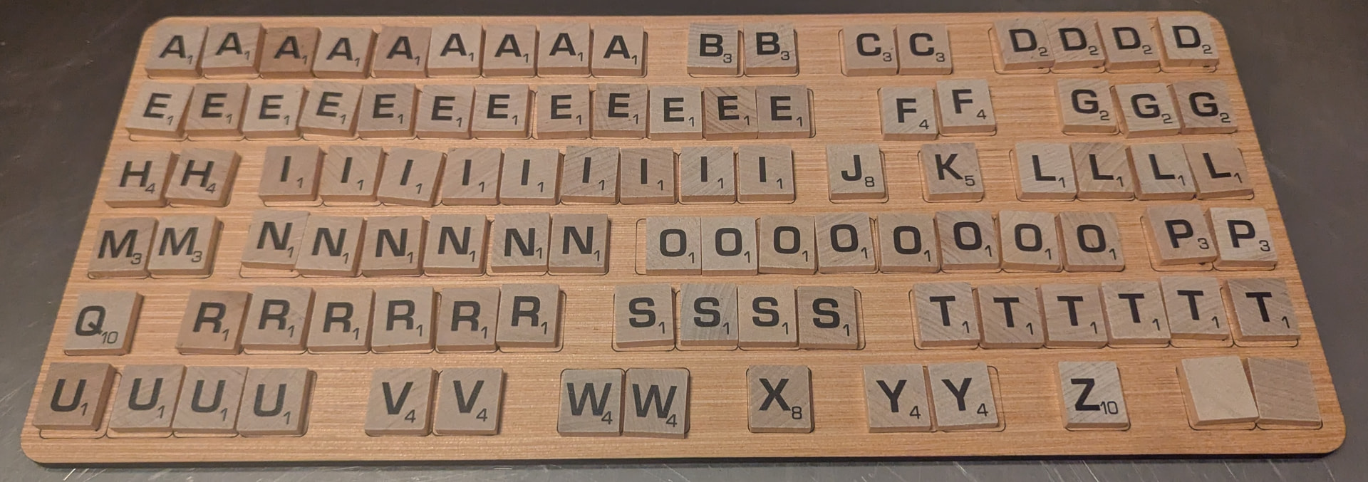 *Trivia note: I believe the reason mass-market Scrabble tiles are end grain is simply production. It allows them to make “dowels” with the appropriate cross section and then slice them into vast numbers of tiles (like making branch cookies). This means the machinery only has to profile one dowel instead of many tiles, and since lumber is virtually unbounded in the tree’s vertical axis, it’s a very efficient way of producing vast numbers of tiles. Still, for a small-market custom set, I’m of the opinion that the aesthetics of face-grain tiles wins out.