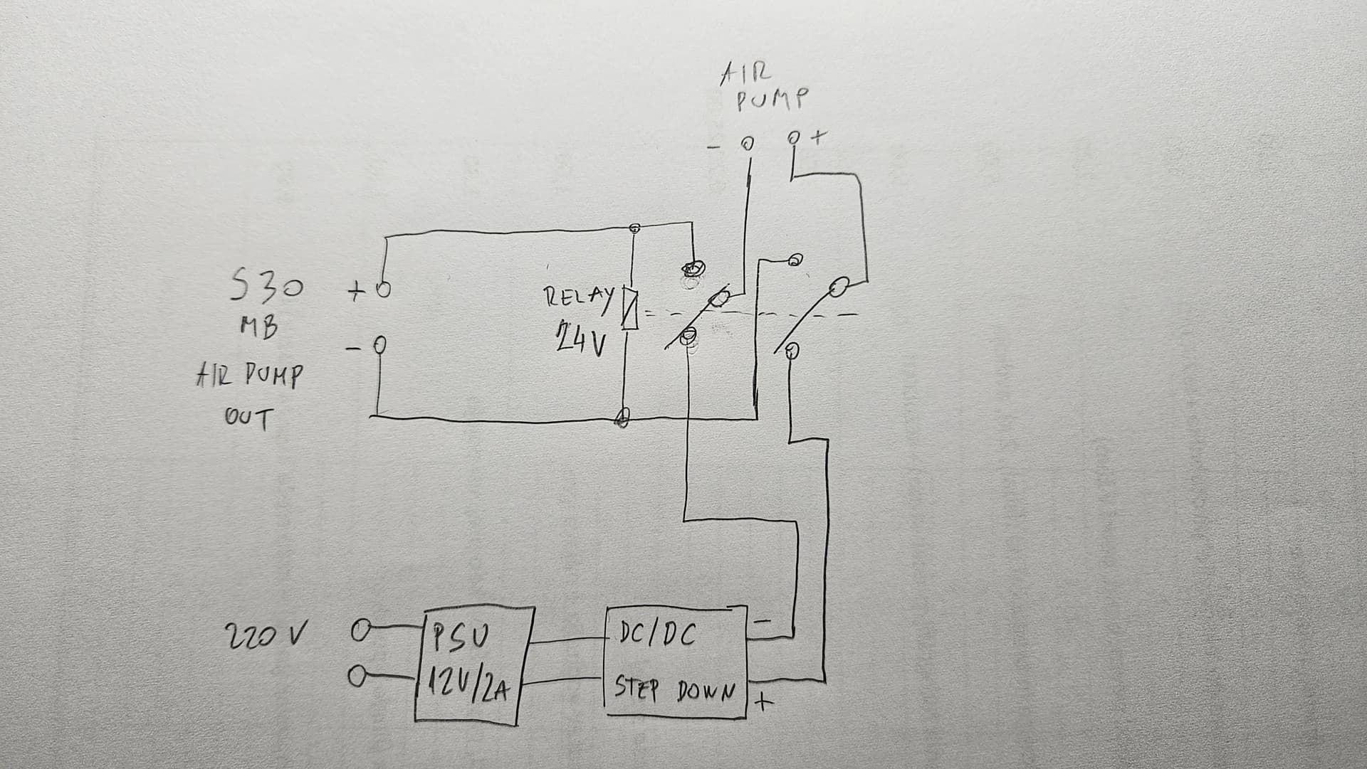 When cutting, the S30 control panel switches the relay ON and the same 24V supplies the air pump, while when engraving the relay turns off and the air pump gets power from an additional 12V power supply. And the relay has a built-in flyback diode.
