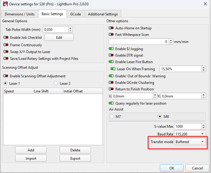 Hmmm… Thank you Melvin. Brand new USB leads from computer to laser machine. I will swap a couple out and see if that has any effect. I did not find a device setting in LightBurn that refers to buffered transfer. Is it somewhere in the computer? I have been a Mac user since the 1980s and do not know anything about the Windows OS. I am using Windows 11 Pro for Lightburn and my CNC machine.