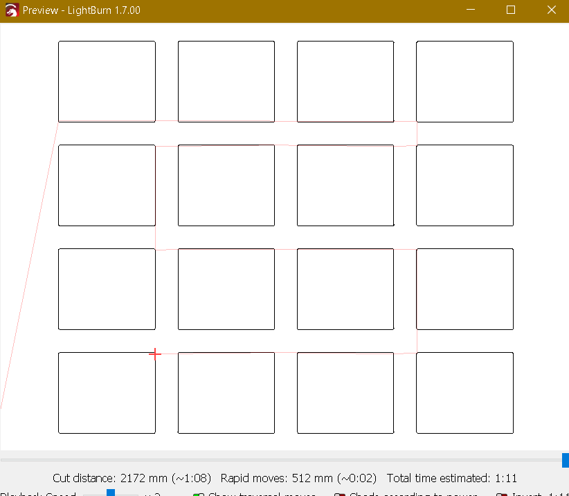 In reality, it (probably) doesn’t matter. Diode lasers cut slowly enough that rapid non-cutting moves add up to a small fraction of the total wall-clock time. Take a look at the Preview summary to see how it works out; if you have never updated all the simulation parameters to match reality, do so before you start worrying.