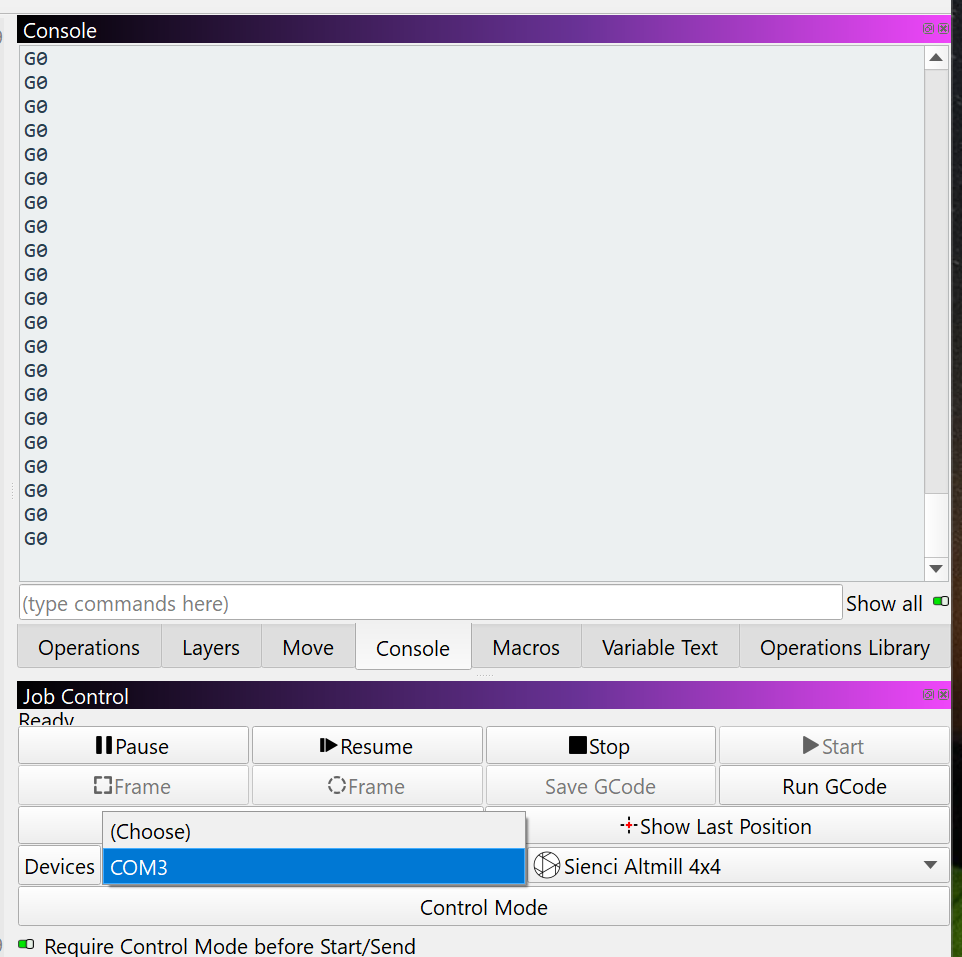 After checking the estop, I loaded Gsender, connected to the Altmill, then pressed the unlock button on Gsender. Closed Gsender, started Millmage, and I immediately saw a stream of data in the console from the Altmill controller. Was at that point able to home the machine.