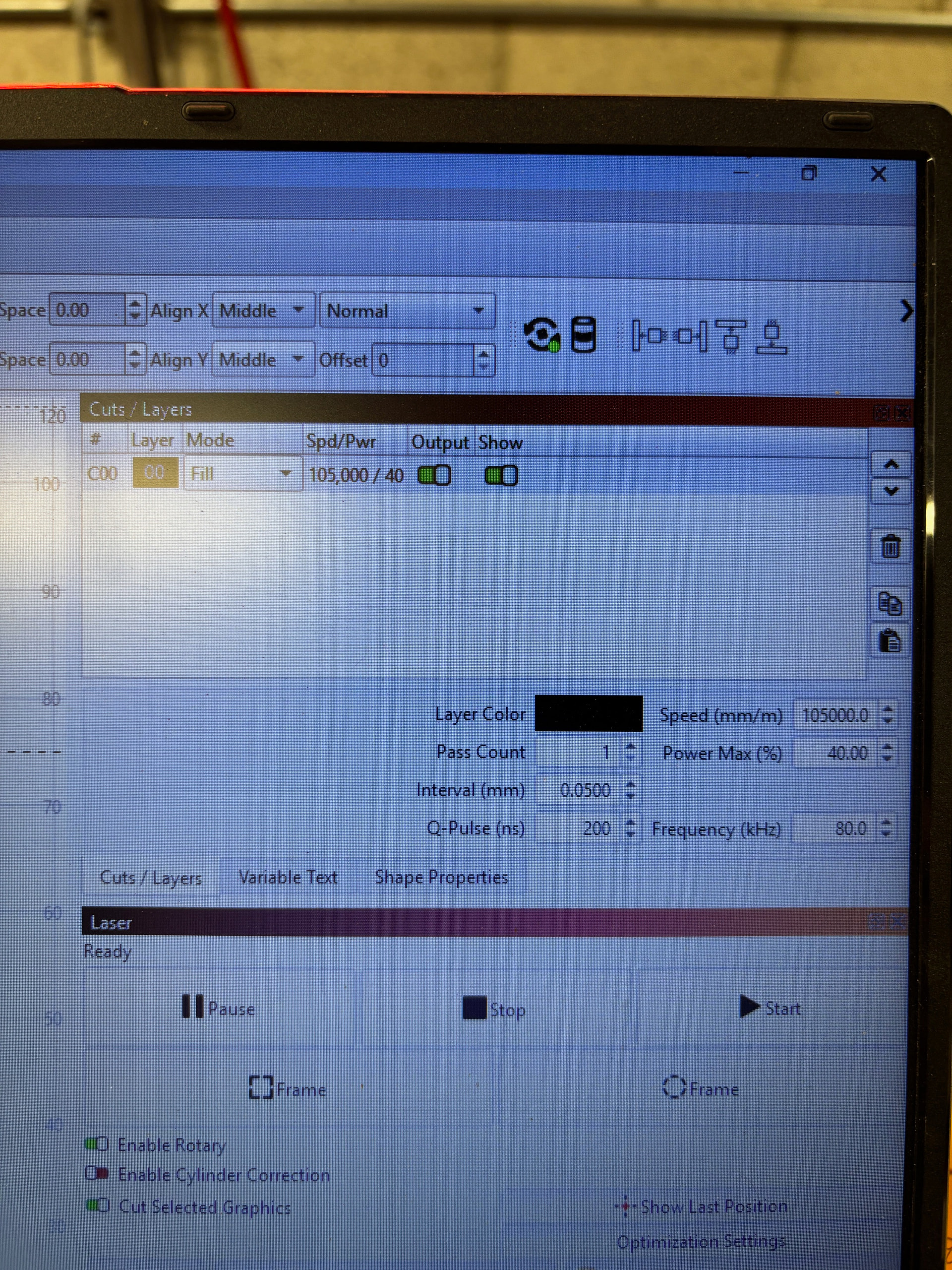 While editing a drawing to change text I have had Lightburn randomly change the speed settings to something astronomical. This has occurred several times and Lightburn will not let me change the setting. I have to close out of the program and restart to get my saved settings back.