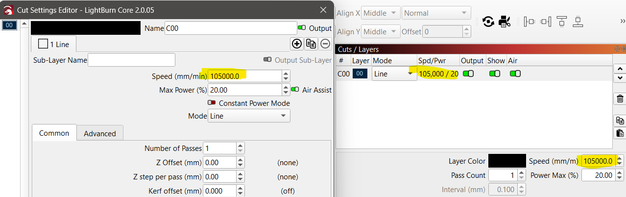 I have noticed the different ways speed settings are shown between the Cut Layers display and Cut Settings Editor As you see the Cut layers are seperated by a Coma, and in Cut edit not coma is used until it become a decimal of a whole number.