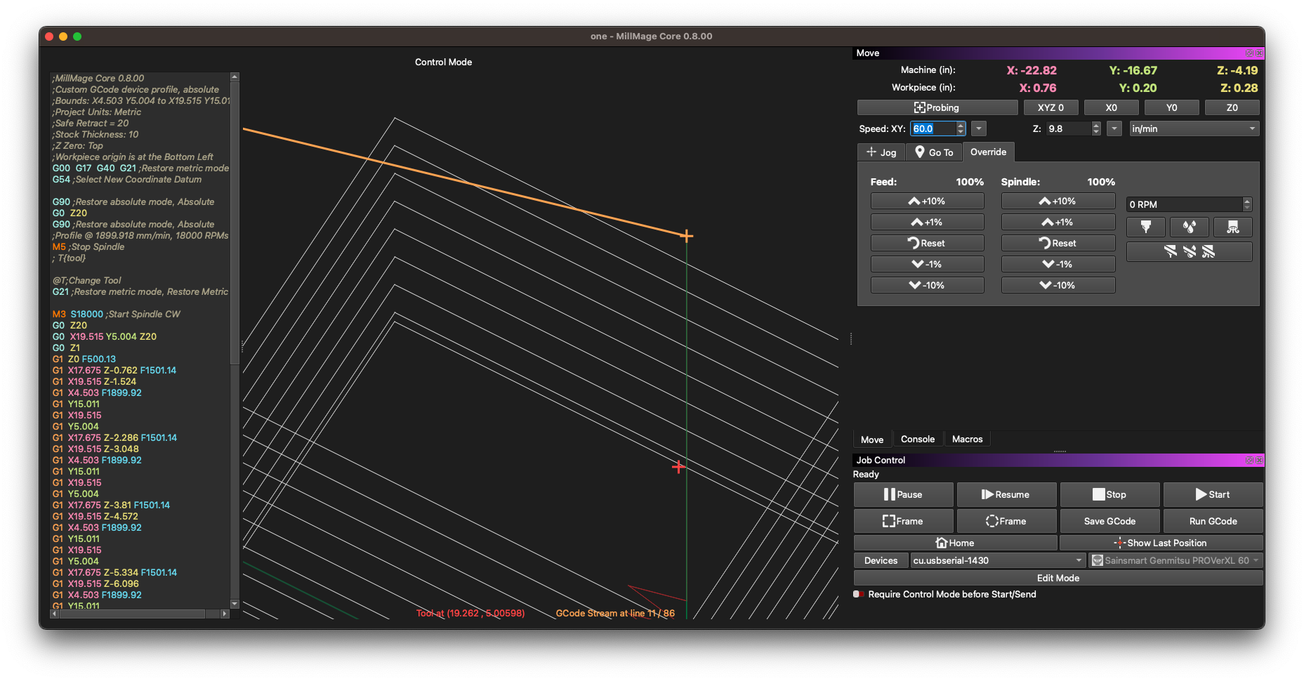 I also exported the gcode for the single operation I have in MM. I load that .gc file into gSender and run it. I have no bit for safety. The spindle turns on and begins to “cut” to profile.
