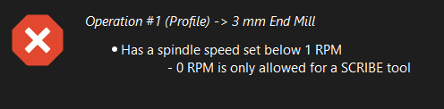 After quite a bit of head‑scratching (including re‑watching a few videos), I eventually opened the Operation Settings editor again and noticed the caution icon next to Spindle Speed. That icon currently isn’t “hot” – there’s no tooltip or message explaining that a 0 RPM value will prevent the operation from being considered valid for preview/runtime.