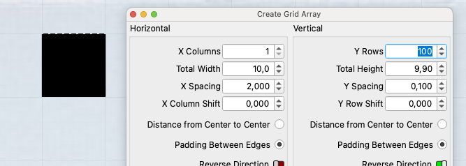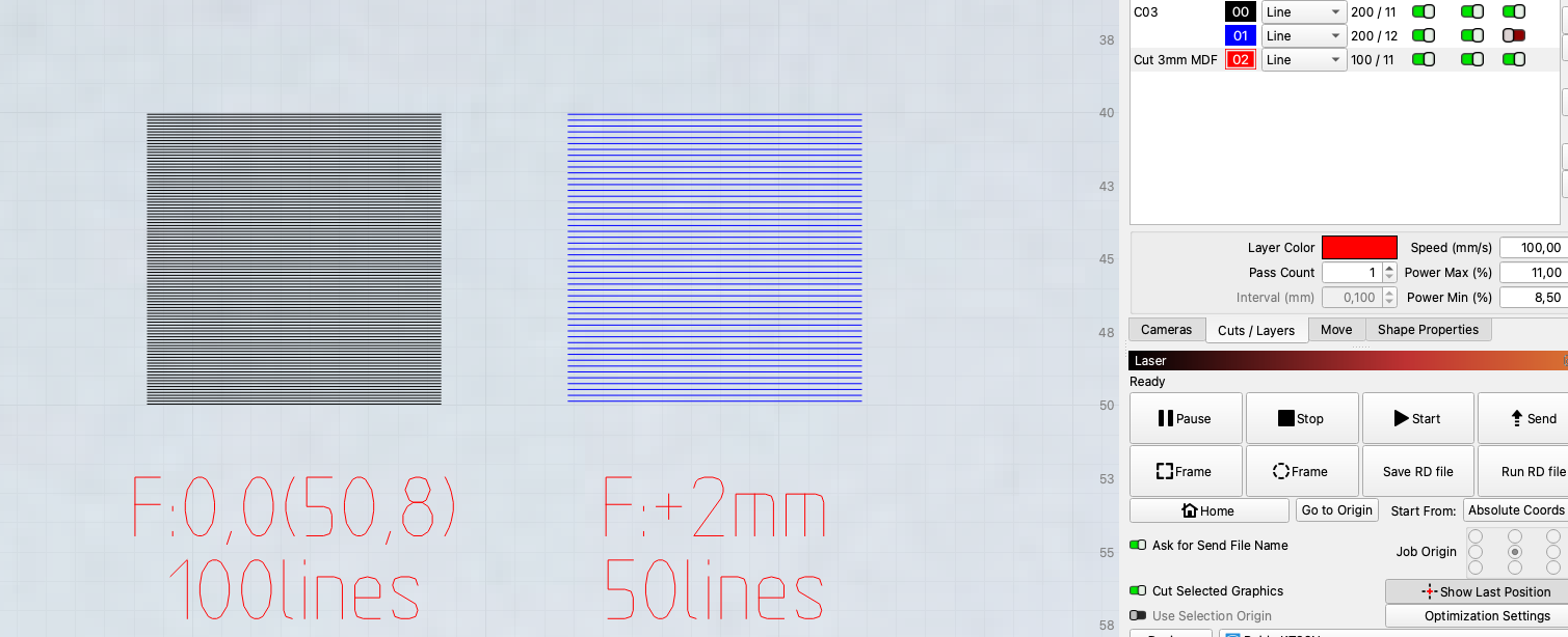 In my example, there are 2 black boxes, consisting of 10mm lines. One box has 100 lines, the other consists of only 50 lines. But at the same time as I halve the number of lines, I have “defocused” 2mm. This gives roughly a twice as wide line or better said focus point on the material.