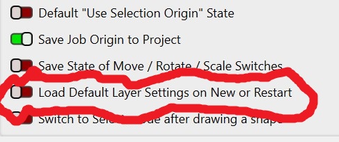 Then close and reopen Lightburn. Pick a layer color and whatever you set as defaults for that layer will be applied.