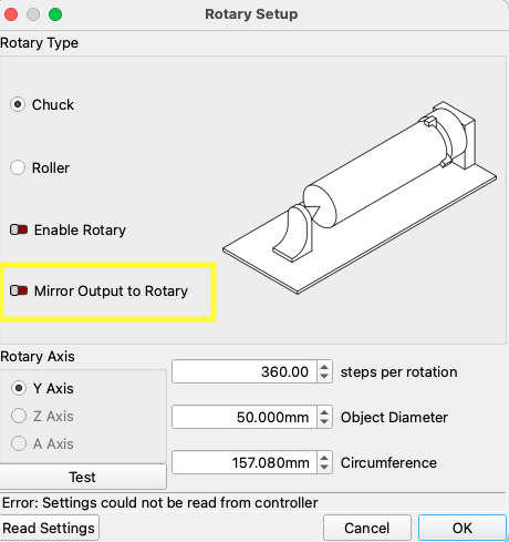 Lightburn has no trouble outputting rotary jobs for the Trocen controller, I enter the rotary settings through the controller panel and I can send to the machine and use the rotary. The only issue is that my artwork is sent mirrored on the Y axis. Yet the same art work engraved fine when I was engraving flat stock(not the rotary function).