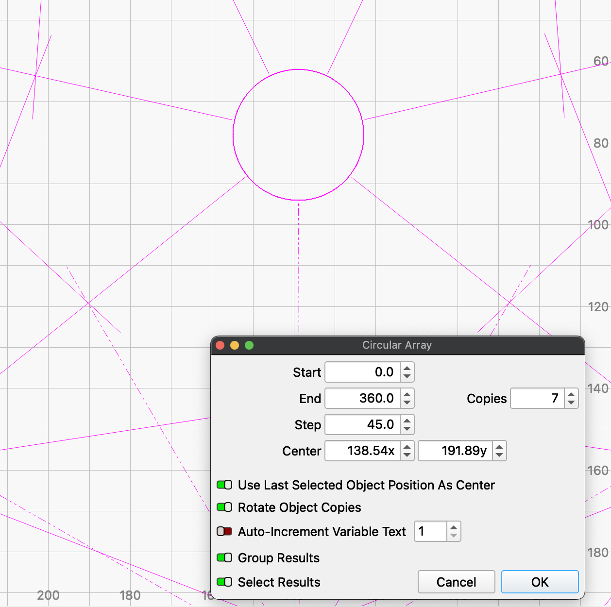 At this point, it should have added the 11 other circles at the end of the lines. Mine does not. It just dumps the 11 copies on top of the original.