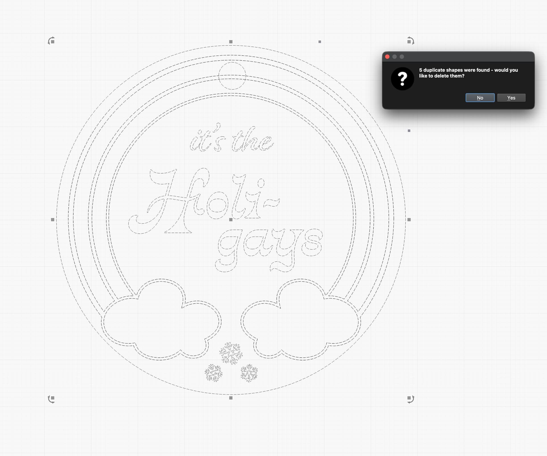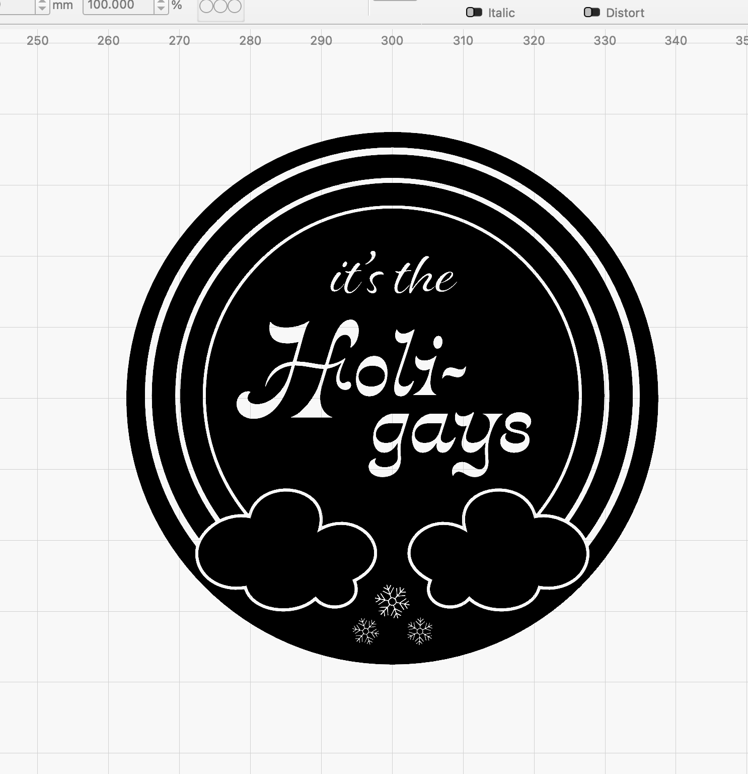 Hi! My name is Shelby, and I am working on a holiday ornament project in Lightburn. The design I am having issues with in my file is the “It’s the Holigays” ornament.