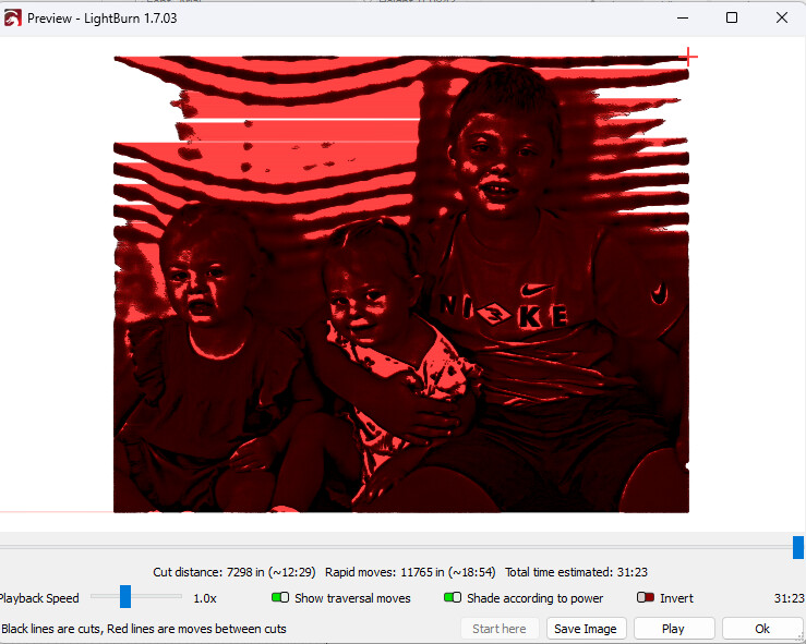 Hi Jim! Thanks for your reply! Once I turned on “show traversal moves" I immediately saw the issue. When I researched what overscan is, I got it figured out… for one pass! Had it going, but speed was too fast and power too low so it didn’t burn anything (after adjusting the overscan value). So I stopped the job, increased power, reduced speed (from 17000 to 3200), and now it’s doing it again! I turned off overscan but that didn’t help a bit! This thing was working perfectly until the upgrade and burning a test grid on a couple of different media.