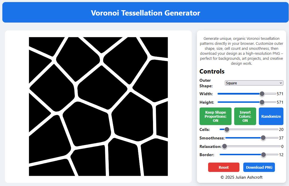 I wanted to create some ‘organic’ style cut-outs in plywood, without spending lots of time drawing shapes on screen, so with a bit of help from AI I made a website which does it for me, creating Voronoi Tessellation style shapes, that can be partly manipulated and can be used as patterns or cut-outs. The site isn’t perfect, and I would like to add new features such as svg downloads, instead of just the current png. The site is available for anyone to use, if you find it useful or if you have any constructive comments please let me know. You can find it here: Organic Voronoi Tessellation Generator | Create Unique Patterns Online