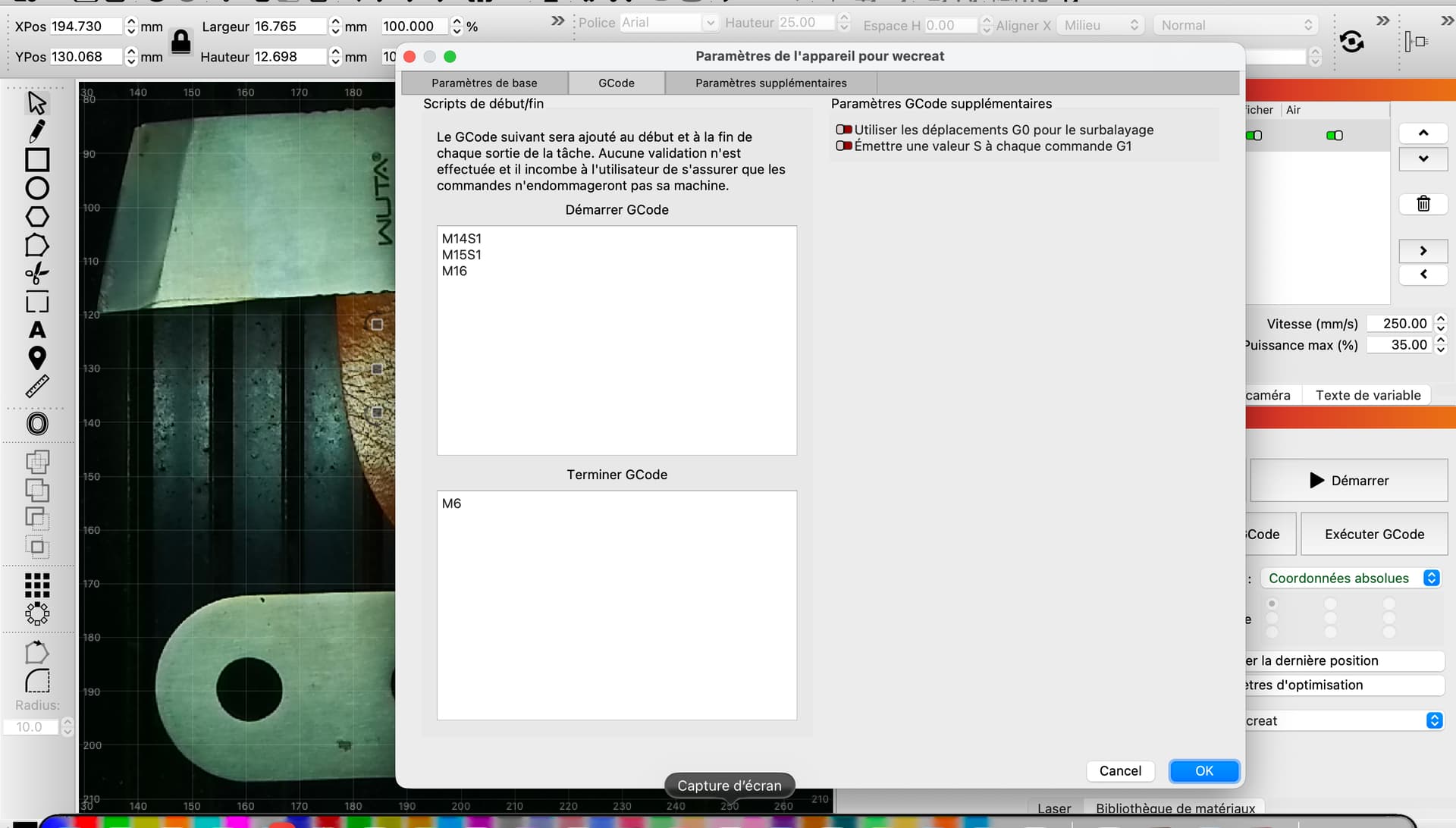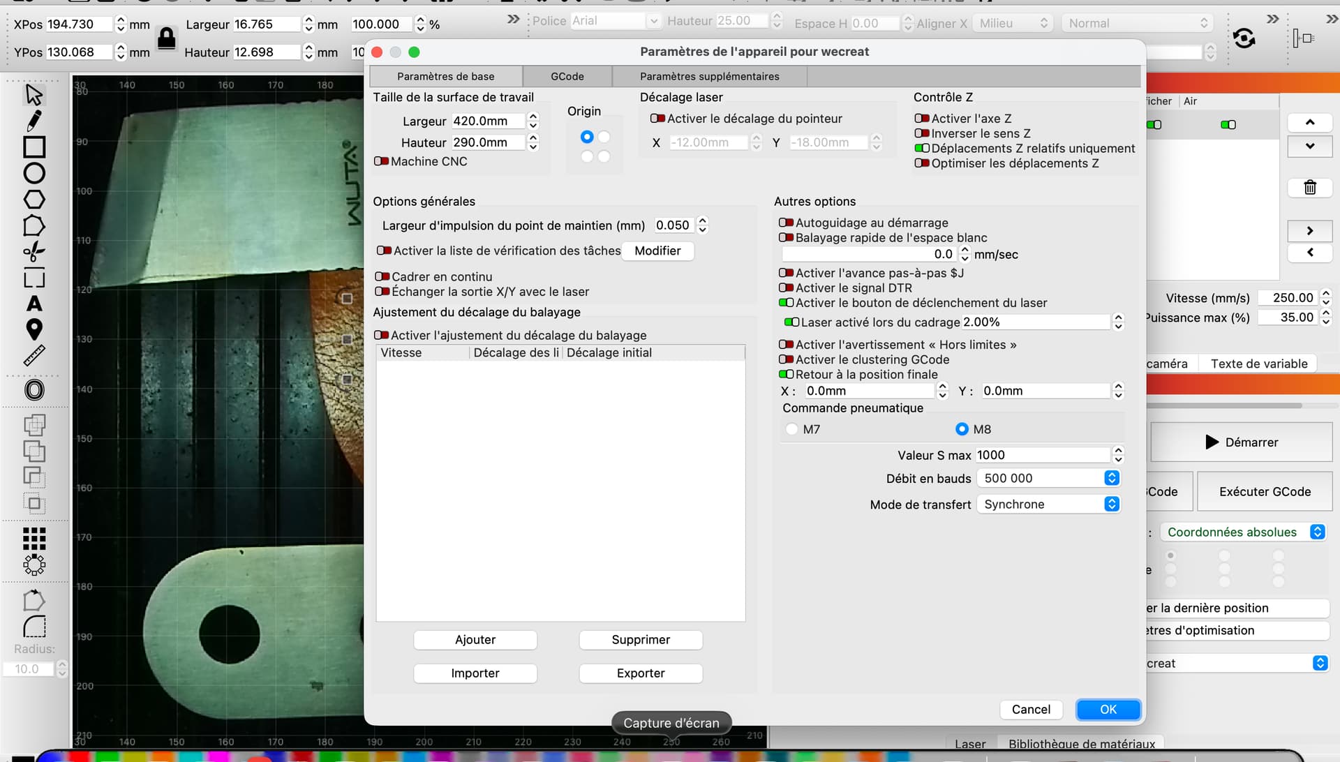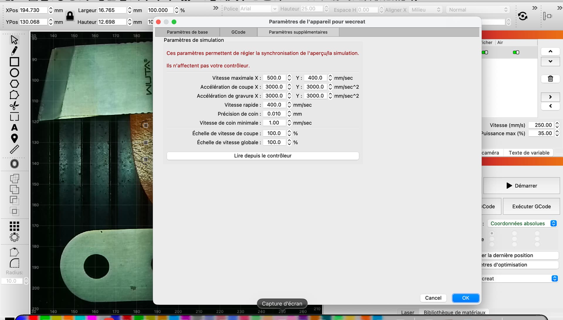 Bonjour, je ne suis pas un grand habitué des forums donc je m’excuse Par avance, si tout n’est pas clair. À la suite de gros problèmes de Déplacement, déplacement des différents éléments par le logiciel natif de ma machine Wecreat J’ai décidé d’utiliser le logiciel LightBurn. Comme fréquemment citer la mise en place n’a pas été simple, mais je finis par obtenir enfin un tracé correct sans distorsion, ni déplacement des différents éléments. Par exemple découpe extérieur, gravure etc. Le problème qui se pose aujourd’hui, c’est au niveau de l’affichage de mon plan de travail qui est tourné à 90° vers la droite Contrairement à l’affichage de la partie commande caméra qui est parfaitement horizontale, j’ai fait le tour des différents réglages sans trouver de solutions. Si quelqu’un est en mesure de me donner des pistes, ce serait génial je pourrais enfin me remettre au travail. Merci par avance.