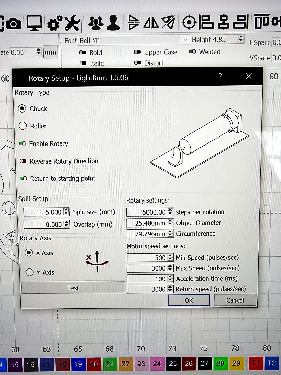 I rarely use the “Run Whole Shapes” setting with my galvo (Chuck Rotary), like if running small text only and along the Y axis, and would limit the size to a small fraction of the diameter, like .1 or .2 in your case, not .7…