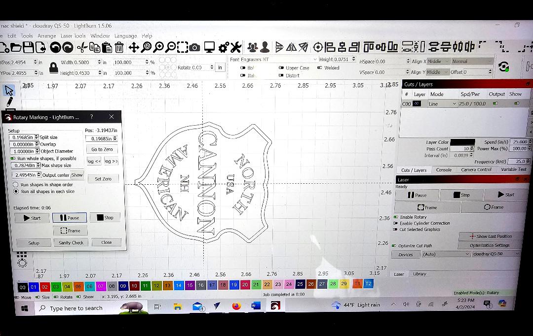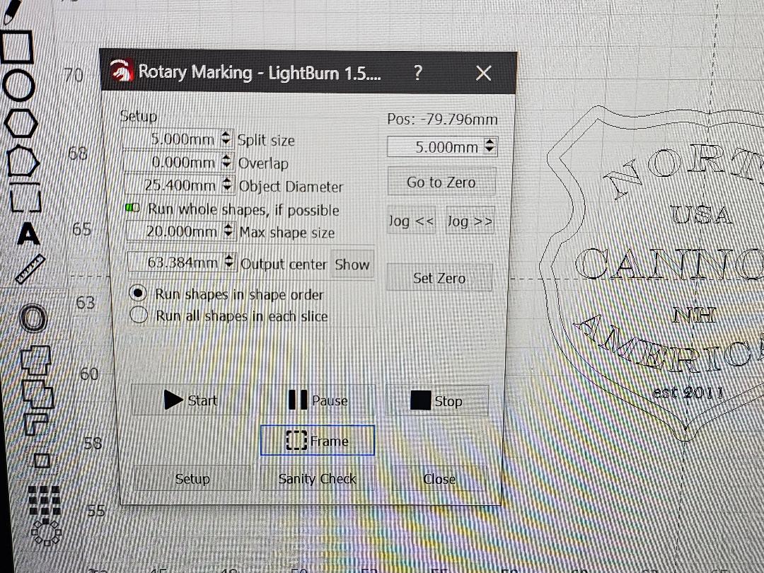 hope these pics help. I am new to fiber lasers, or, lasers in general. I’m machinist and use vcarve on my cnc. instead of importing the shield vector into lightburn from vectric as an svg file, I just did the whole thing over in lightburn to avoid any import issues. in these pics, you can see how it looks flat, and what the image looks like on the rotary. I’ll try doing what everyone has suggested with the “run whole shapes” off… i can only upload 5 files at a time- i’ll do it in 2 posts.