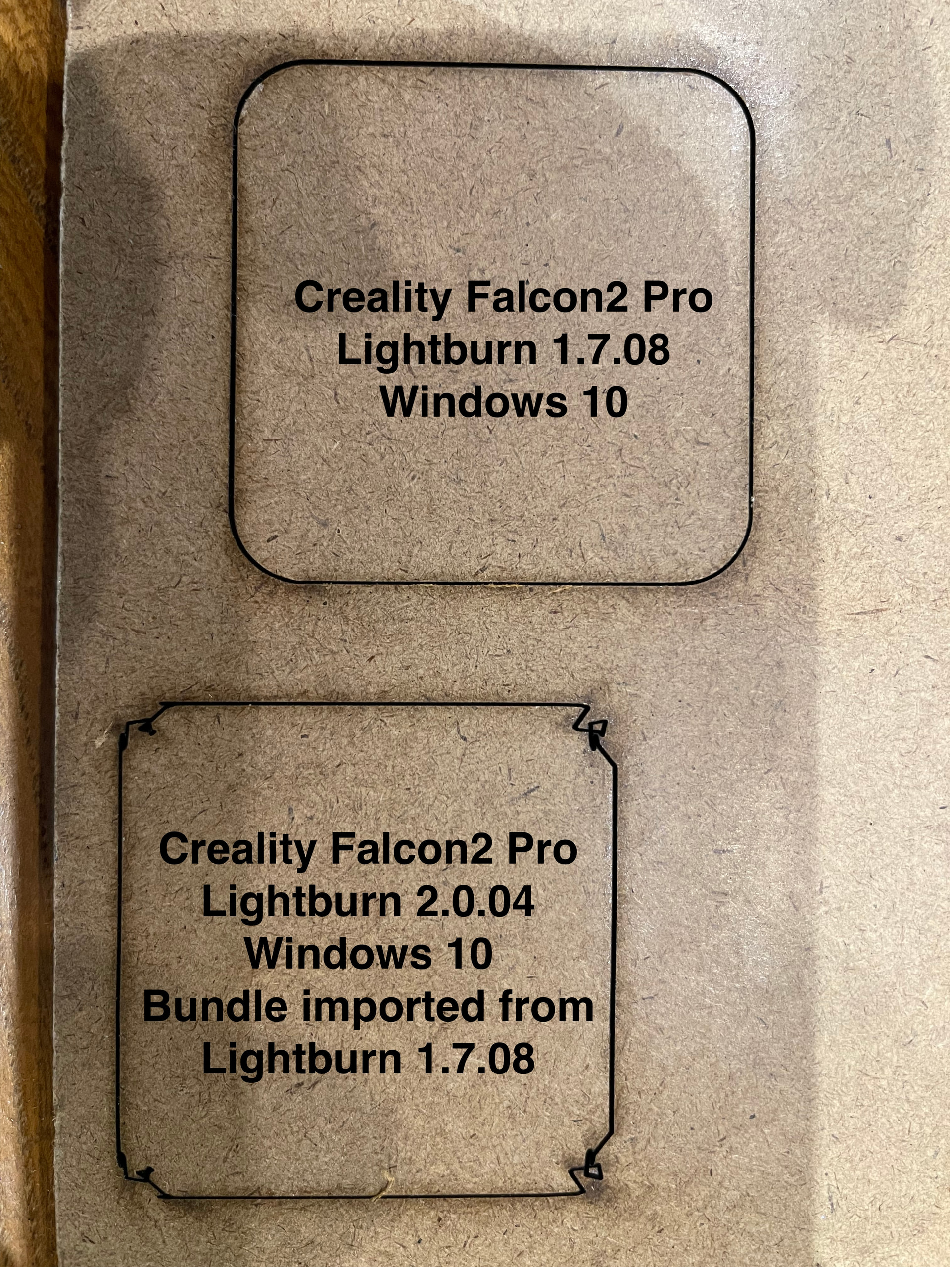 I exported the settings from that version of Lightburn, installed Lightburn 2.0.04, imported the bundle and tried to cut a square with rounded corners. As shown in the new picture, I still get wonky corners.