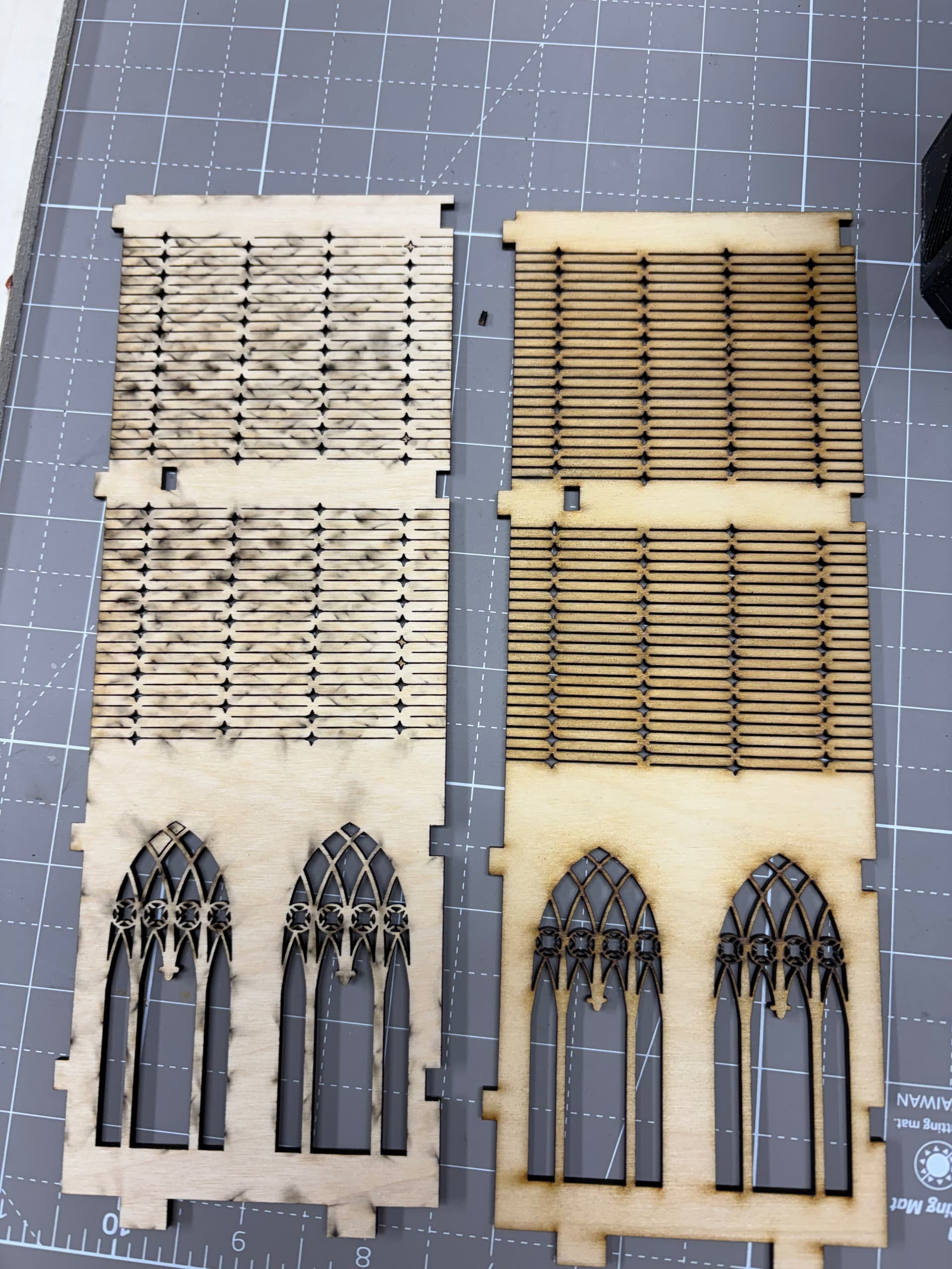 The fact that You have to use three passes even with a powerful laser IMO supports this, especially if it’s a 3-ply plywood since You are able to reasonably cleanly cut through one ply and one adhesive layer at a time, but the more or less molten soot prevents You to cut deeper cleanly.