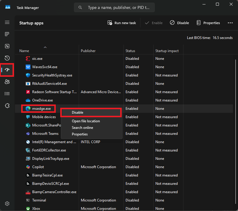 Did you try disabling MS Edge for auto-boot? Select these options, then reboot: