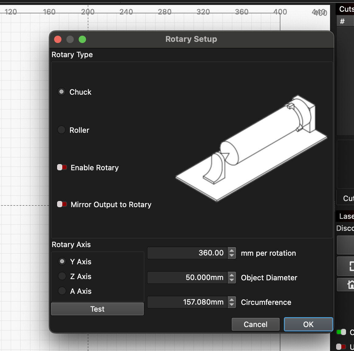 Rotary mode uses a different setup — you’ll need to enable or disable it each time you switch between normal use and rotary work. It’s effectively a separate profile for a different motor and Y-axis configuration. Go to Laser Tools → Rotary Setup to manage it.