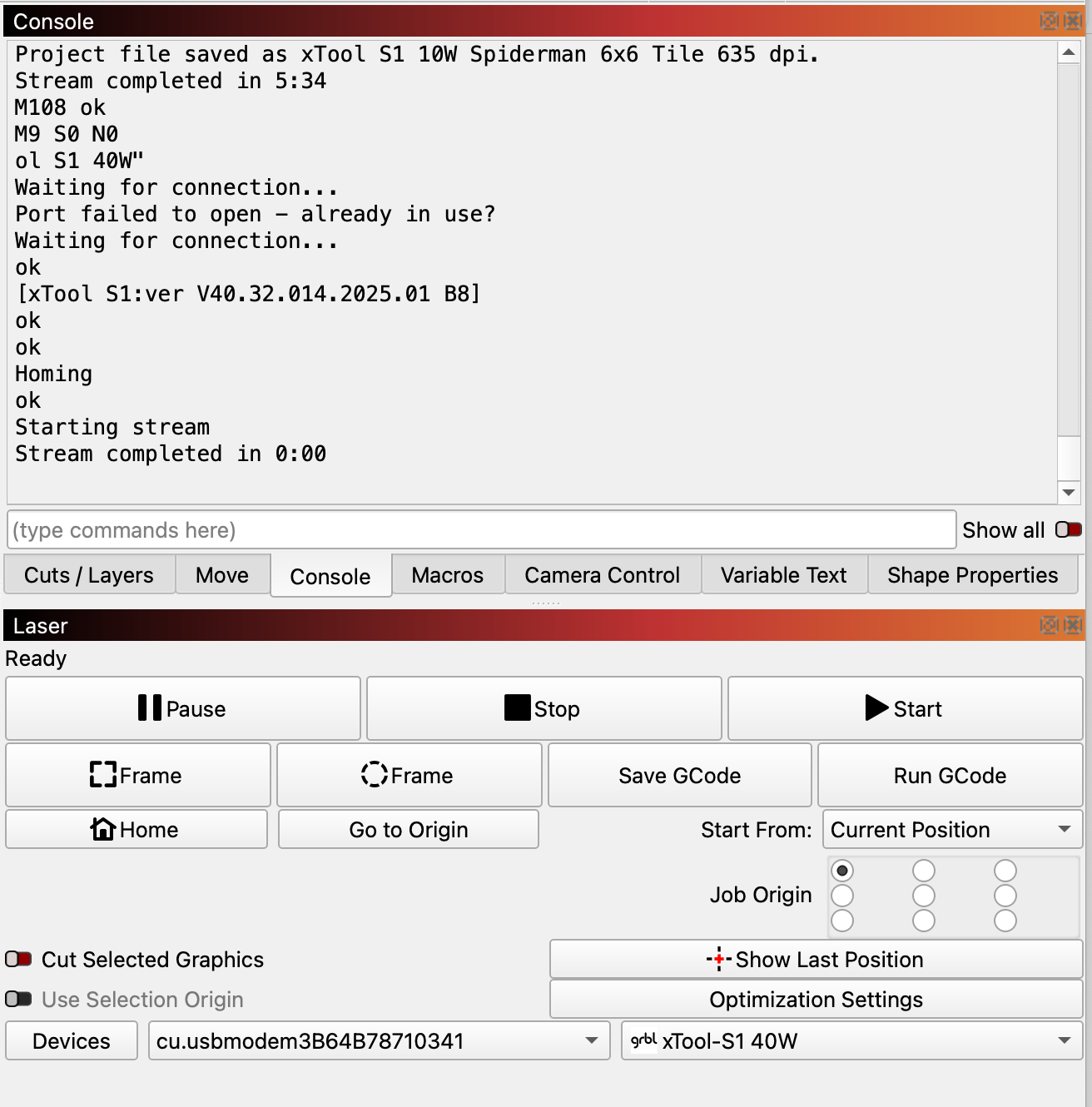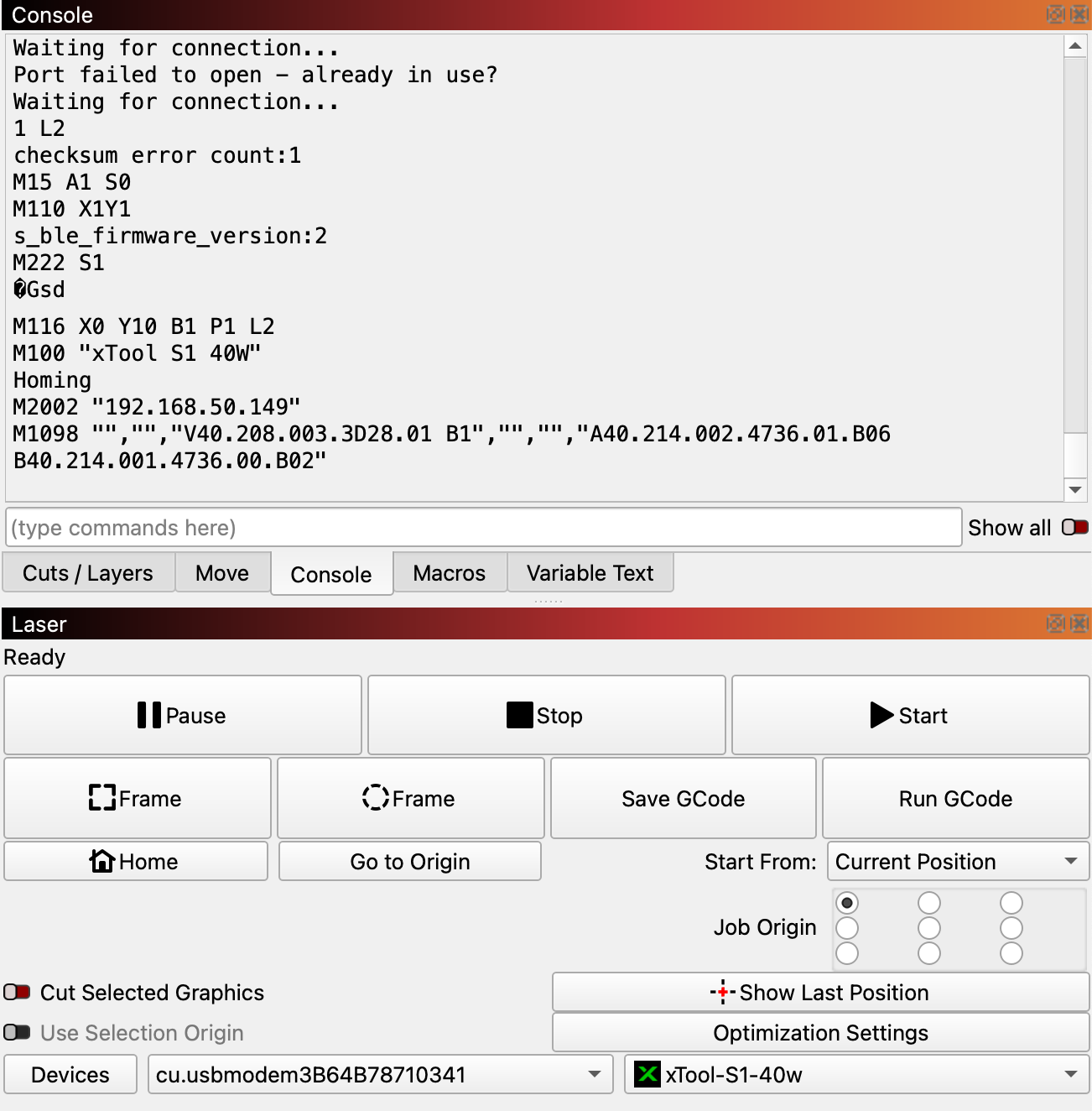 Note that I can replicate this on two different S1’s with the 2W IR, 10W, and 40W modules with either the MacBook, or two different Windows 11 laptops.