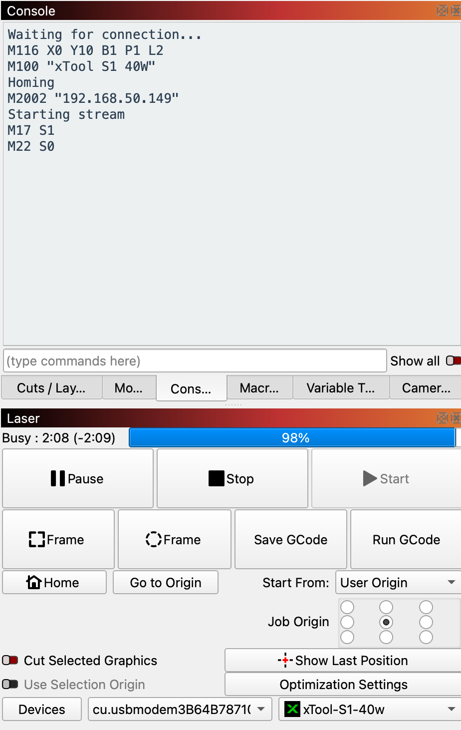 The MacBook was configured for LightBurn using xTool instructions and choosing GRBL.