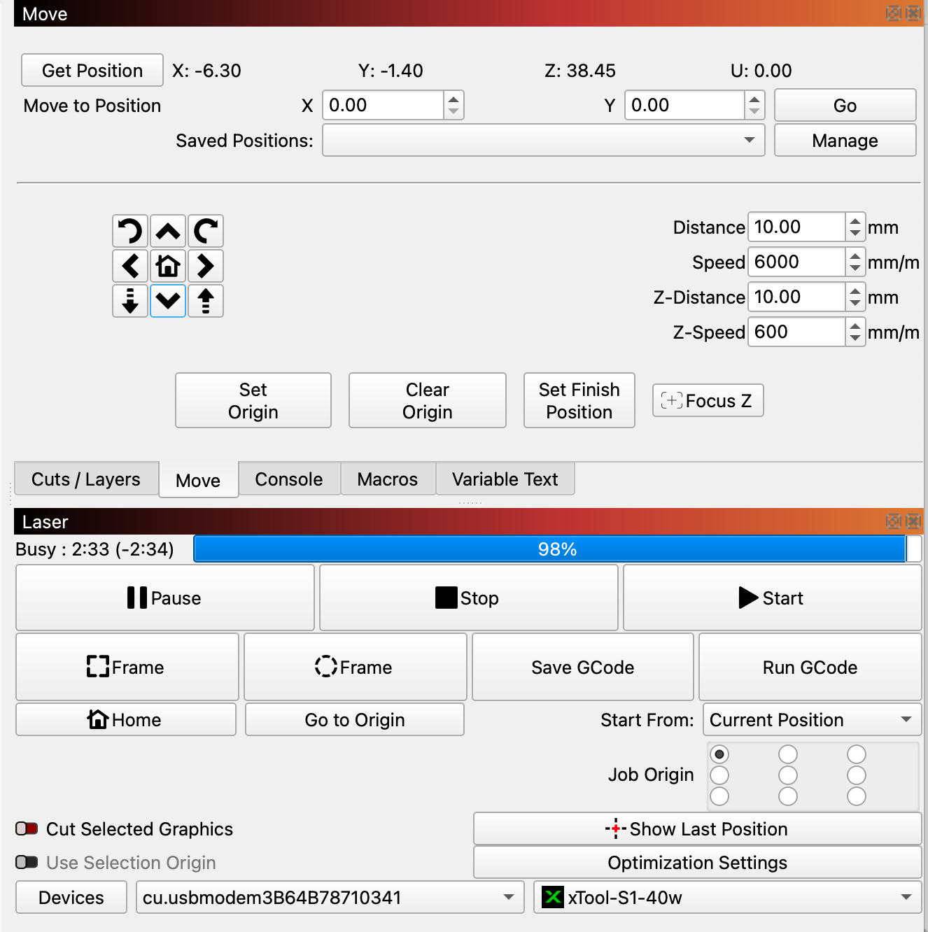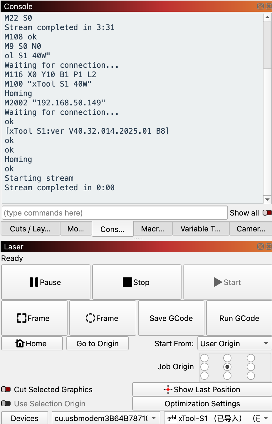 I tried the trial of LightBurn (v2.0.05 and v2.1.00-RC-1) with the xTool S1 and have had great results. Notified of a firmware update, which I installed and I have had the laser head slow down and over burn my project in numerous areas. Now when connecting my S1 doesn’t home, and I can move via LightBurn but each movement shows it streaming until I click on the stop button. Moving again causes the same issues.