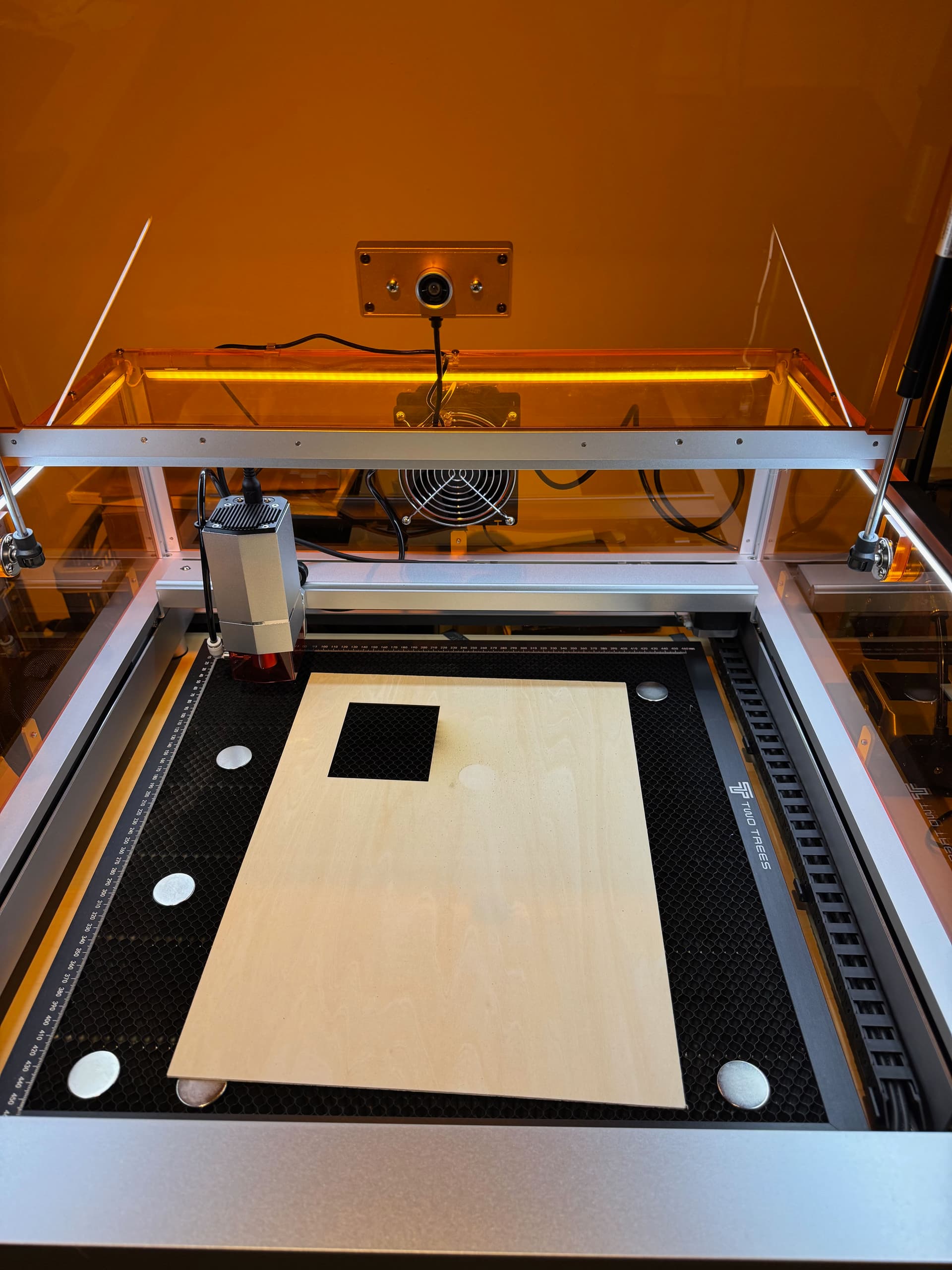 The camera setup was a doddle, their support provides the configuration parameters therefore there is no need for dotted pattern calibration and the image is excellent covering the laser bed perfectly. I also had time left to run interval and engraving tests, the latter cutting through the 2mm basswood sheet almost immediately